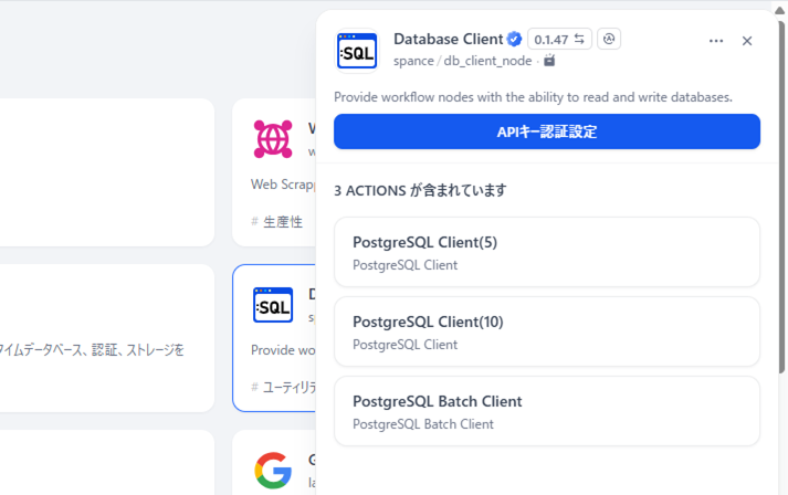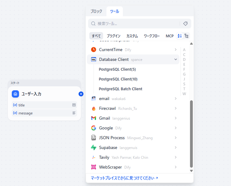 Difyのマーケットプレイスで「database」などで検索すると様々なプラグインが見つかります。汎用クライアントのプラグインも数多くあるので、その中で自分の好みのものを選択すると良いと思います。