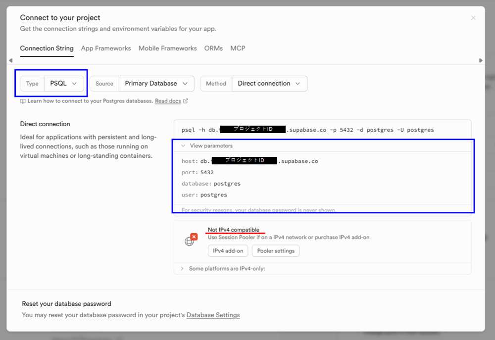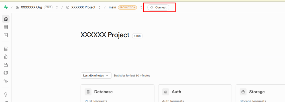 Supabaseの画面の上部に「Connect」のボタンがあるので、それを開きます。