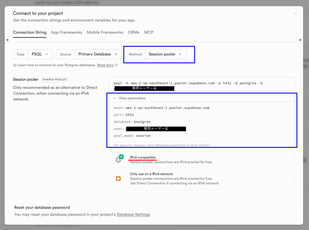 先ほどバツになっていたIPv4もSession Poolerでは IPv4 compatible になっています。
