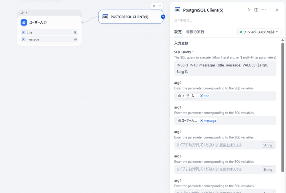 SQL Queryにクエリを記述します。$arg0や$arg1などを使用することでプレースホルダ的に変数の引き渡しが出来ます。今回はユーザー入力ノードのtitleとmessageを$arg0,$arg1としてセットします。