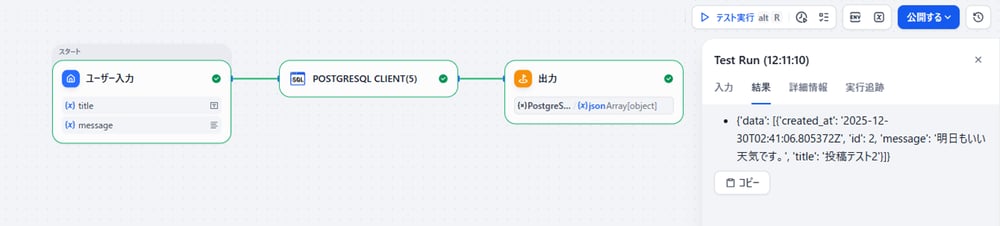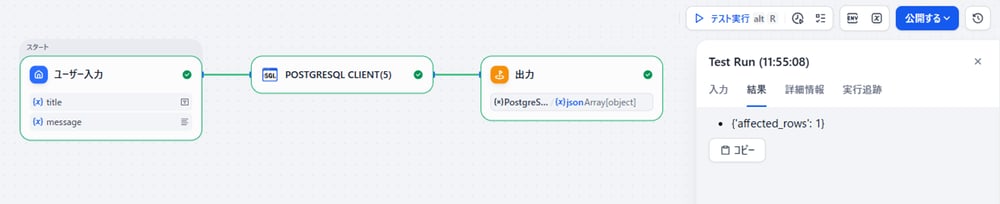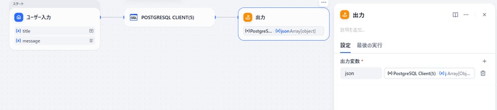 出力変数にはPostgreSQL Clientノードのjson出力を指定しておきます。