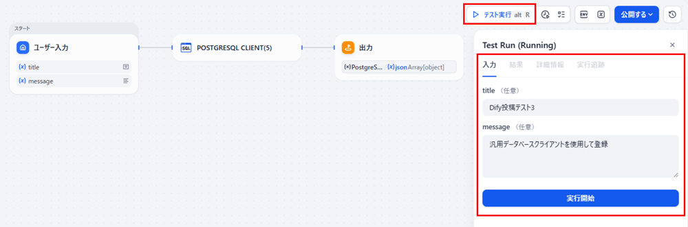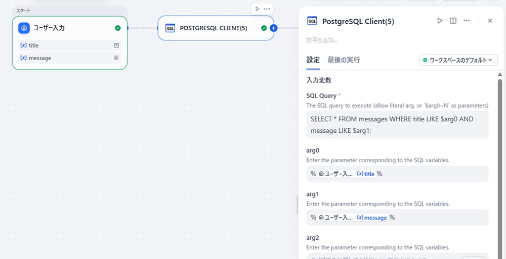 先ほどのPostgreSQL ClientノードのSQL Queryとarg0,arg1を下記の様に変更してみます。