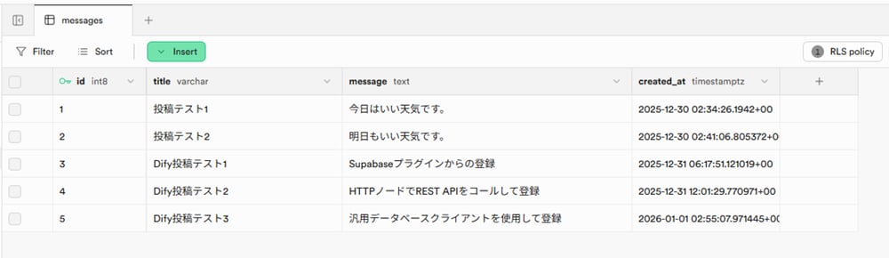SupabaseのTable Editorで挿入後の内容を確認してみます。