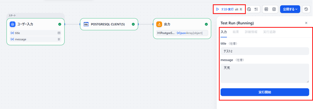 titleに「テスト2」messageに「天気」と入力し「実行開始」をクリックします。