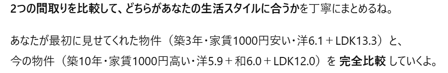 ・物件選びの際に迷っているいくつかの物件の間取りと条件を投げて比較させてみるという点です。