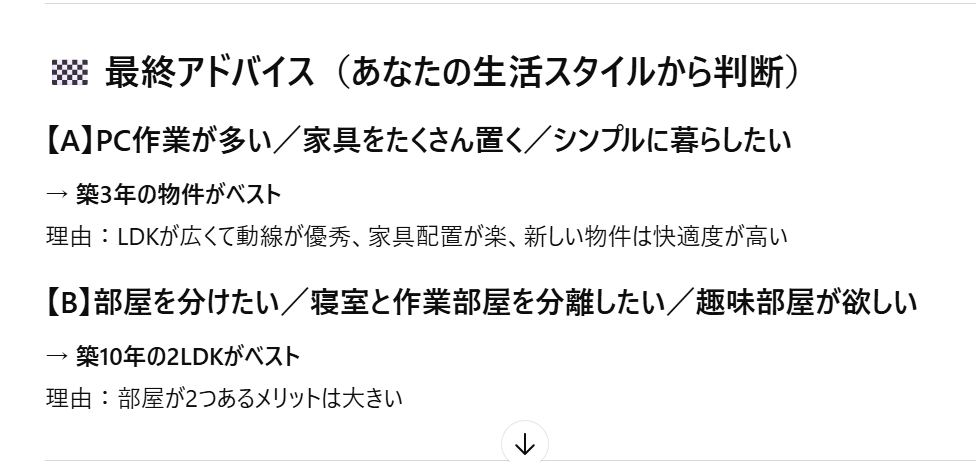 かなり長めに色んな条件を比較してくれました!(画像は最後の結論部分のみ)