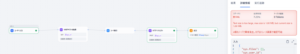 コードノードで出力変数に渡す前に、文字列を40万文字以下にカットします。