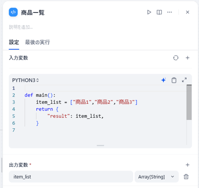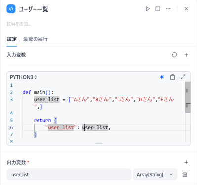 コードノードの出力変数(次のノードに渡すための変数)に抽出したテキストを渡しています。