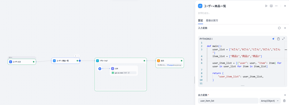 5人のユーザーについて、3つの商品それぞれのレビューを分析するワークフローを作成しようとしました。