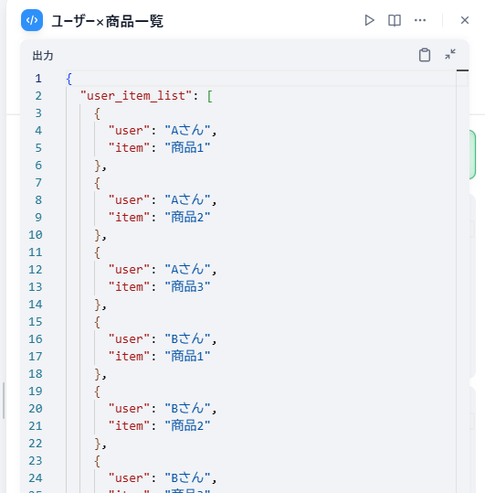 この場合、「ユーザー × 商品」のすべての組み合わせを先に作っておき、その配列をイテレーションに渡すことで、組み合わせ全件の分析処理を行うことができます。