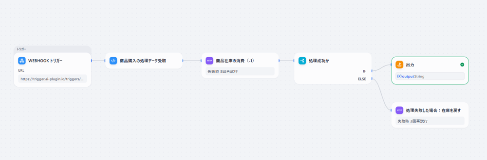 ユーザーが商品を購入すると、ワークフローが起動し、在庫を1減らします。