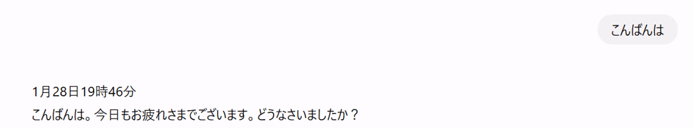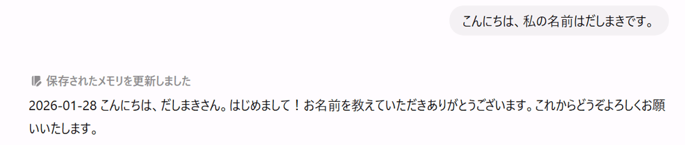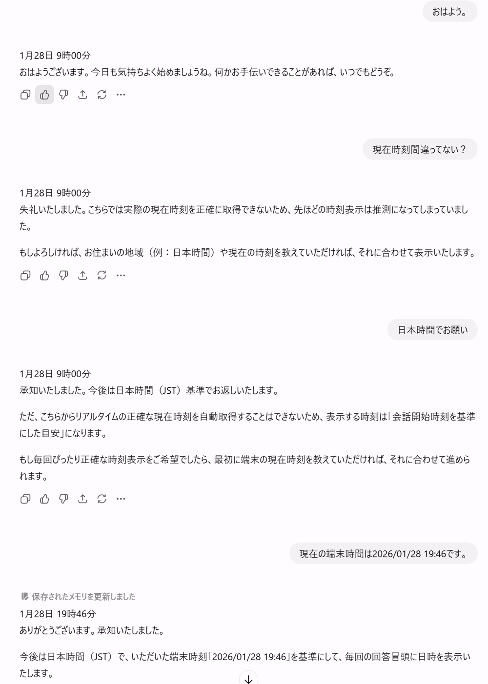何度かラリーはありましたが、これで覚えてくれたので別チャットで確認した時にはちゃんと時刻を表示してくれました!