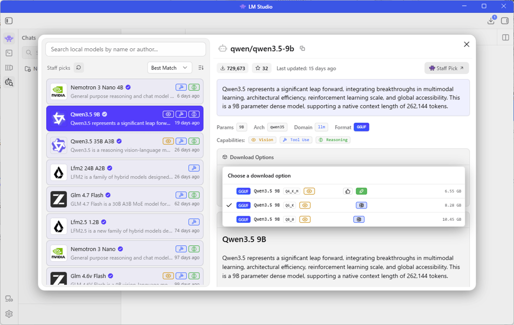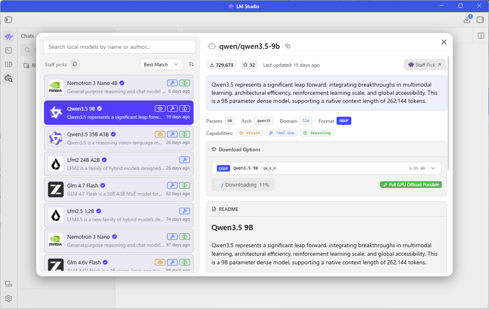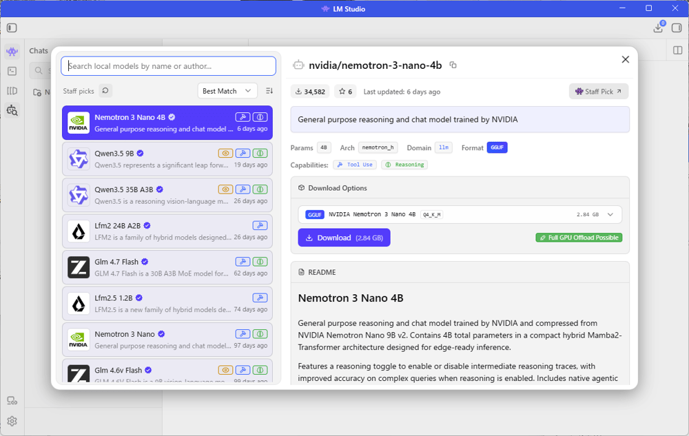 左に利用可能なAIモデルの一覧がでてきます。色々選んでみると右側に「Full GPU Offload Possible」といったグリーンで表示されている所がありますが、これがグリーンならインストールしようとしているPCで使っているGPUのメモリーに収まるかどうかを知る事ができます。今回使っているPCには、NVIDIA 3070という2世代前のGPUでVRAM 8GBです。