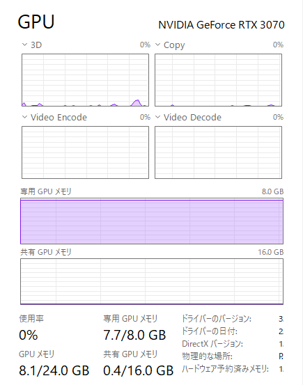 見事にVRAM 8GB目一杯使われています。実際に問い合わせてみると、3DのGPU使用率が80~90%くらいで推移していました。