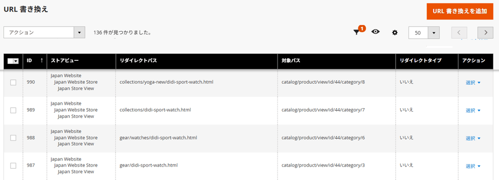 ただし管理画面上では、表示されているURL Rewriteが自動生成されたものなのか、手動で作られたものなのか、見た目だけでは判別できません。