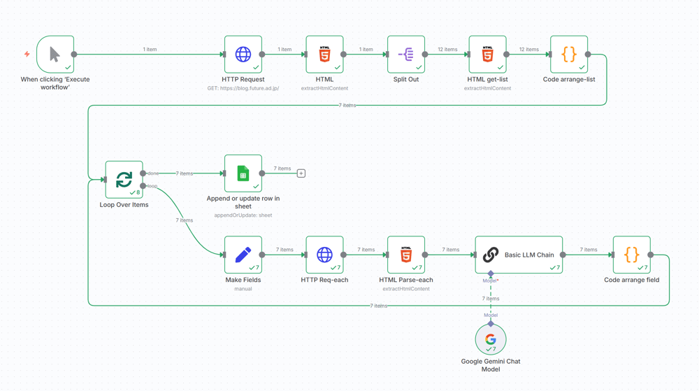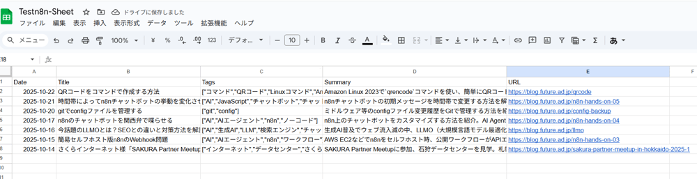 上記のワークフローを実行すると、次のように最新の記事がGoogleスプレッドシートに書き込まれます。SummaryはGeminiによりAIで内容を要約したものです。