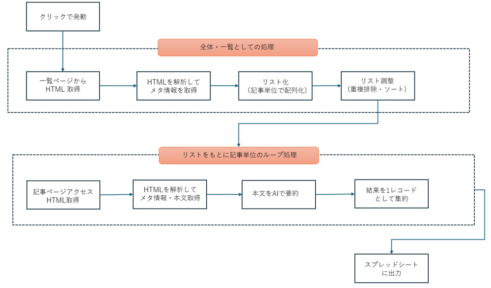 - 結果を記事単位で1レコードとして、スプレッドシートに出力する