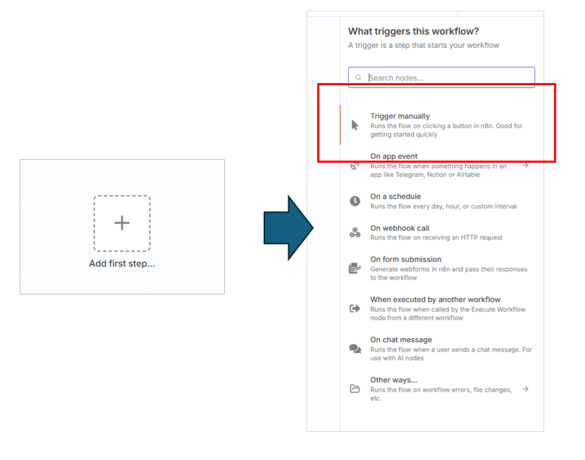 Add first step... をクリックして、「Trigger manually」を選択します。