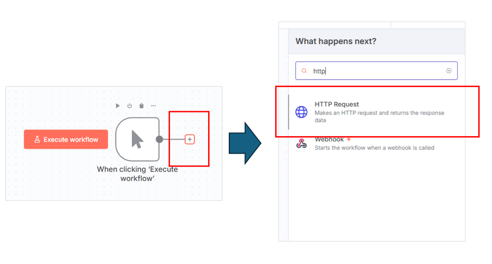 ノードから伸びている「+」をクリックし、「HTTP Request」を選択します。