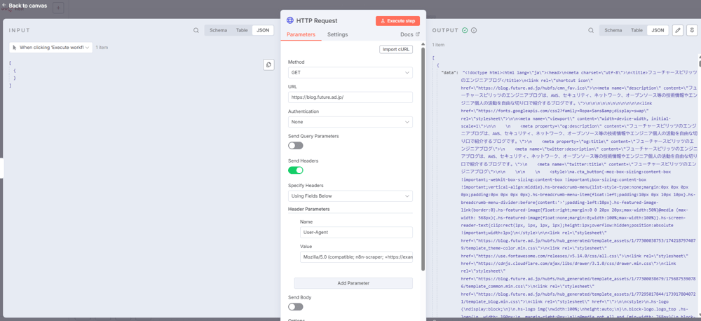 2. HTTP Requestノード:目的サイトからHTMLを取得
