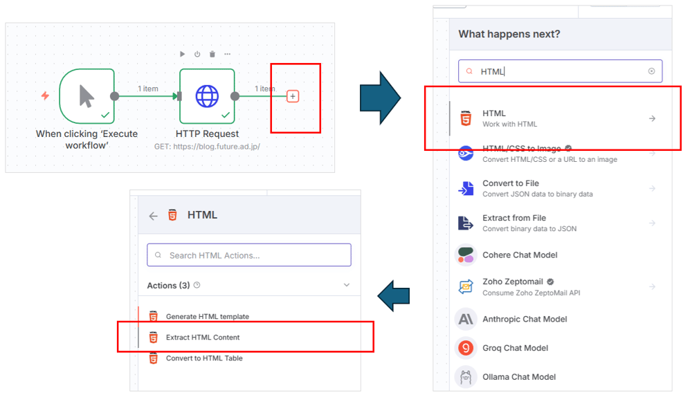 HTTP Requestノードにつなげる形で、HTMLノードを設置します。