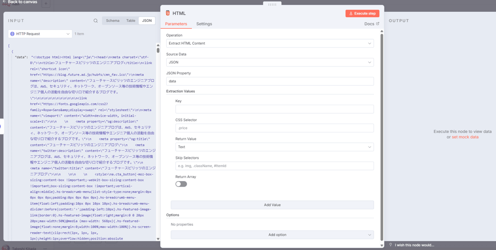 この例では左側に「HTTP Requestノードの出力」を、「HTMLノードの入力値」として受け取っています。