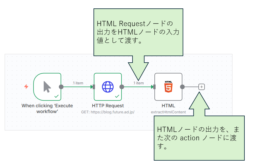 ただし、1つのHTMLノードで複雑なparseを行うのは困難であったりワークフローの見通しを悪くする場合があるので、今回は下図のように、2段階に分けてparseを実施します。