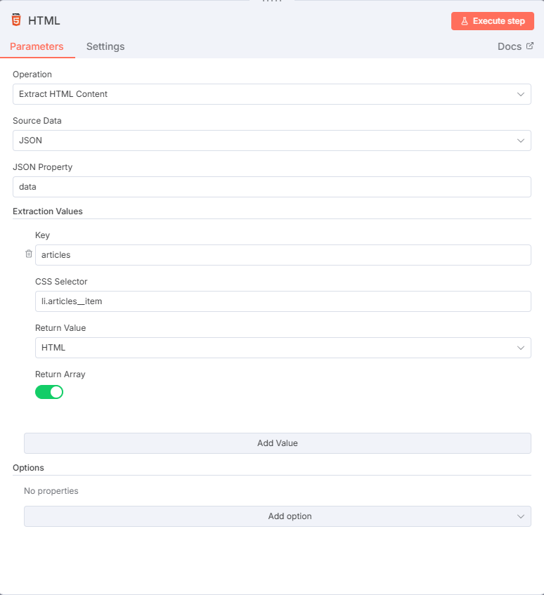 これは、1つ目のHTMLノードの出力が、2階層目で「articles」という配列値を持っていて、2つ目のHTMLノードで「articles」を入力値として扱うように指定することで、暗黙的なループ処理が行われるn8nの仕様です。
