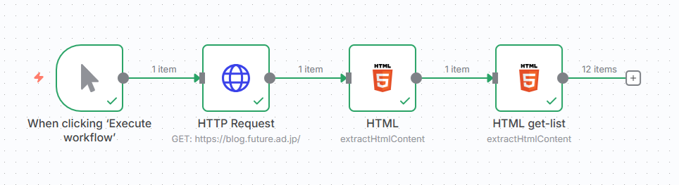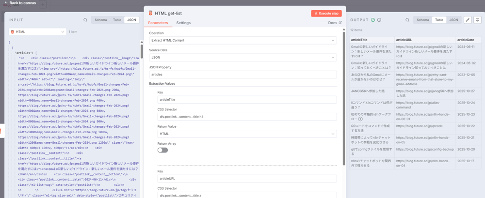 ここまでのワークフロー処理を見てみると、ブログ記事を単一のデータ(1 item) として処理する段階から始まり、2つめのHTMLノードを通ったあと、12 itemsになっていて、データが暗黙的にループ処理されたことがわかります。