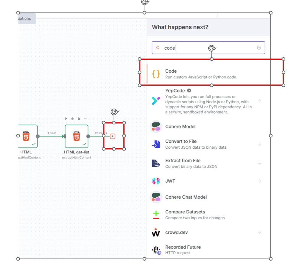 今回の例でいうと、 $('Http Request') でHttp Requestノードの出力値を、$('HTML') で1つめのHTMLノードの出力値を、このCodeノードのなかで取得できます。