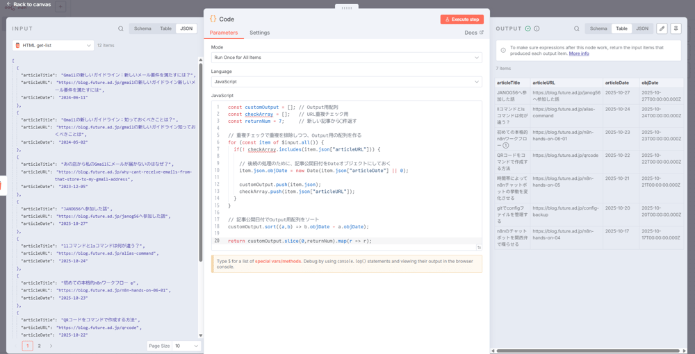 キャンバス上でも、データが 12items → 7items と、Codeノード通過後に変化していることが見て取れます。