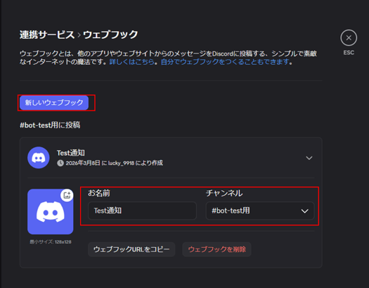 ・Webhook名や送信先チャンネルを設定する