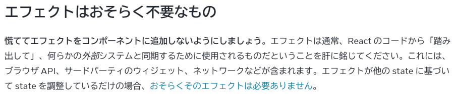 公式でもuseEffectに関しては以下のように記載されており、あくまで「外部システムと同期するためのもの」、、ということで、極力使わないでという意思を強く感じますね😐