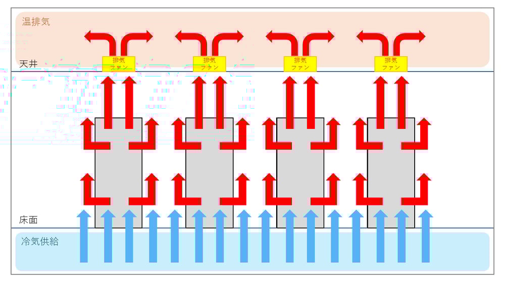 この方式にはいくつか問題があり、その一つがラックからの温排気と床下からの冷気が混ざってしまうため、ラック上段の冷却効率が悪いということです。