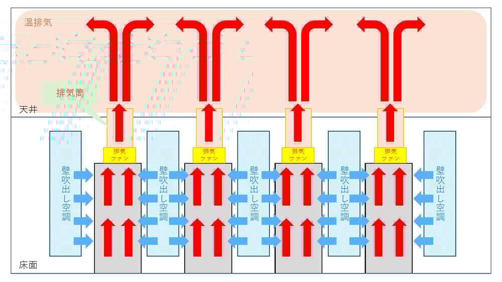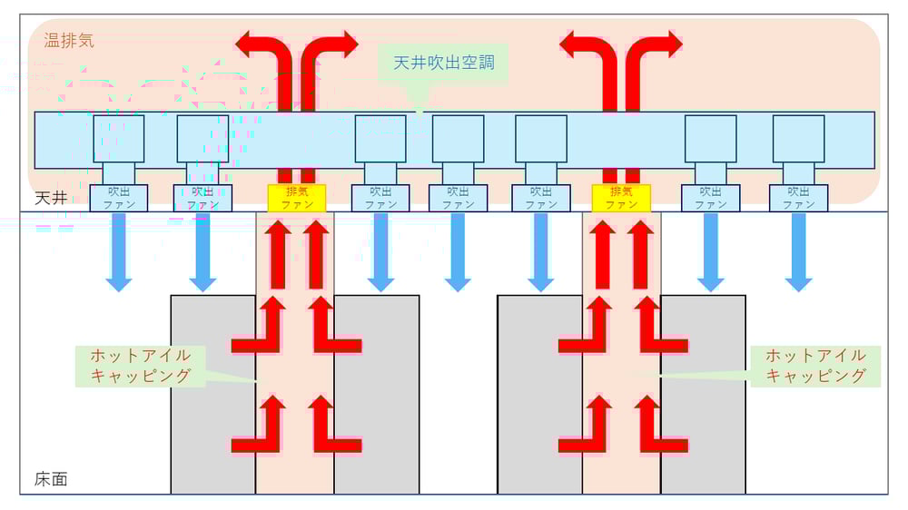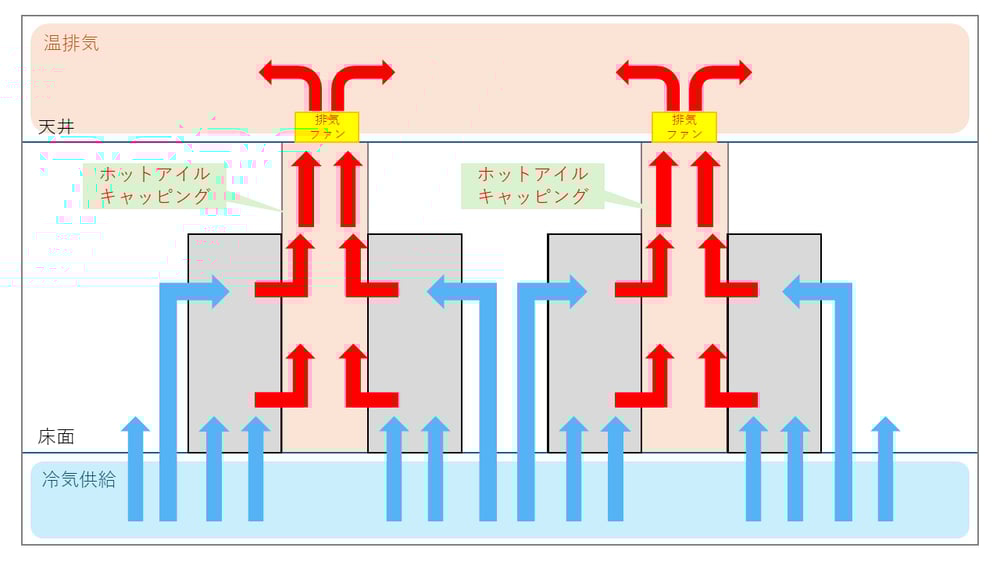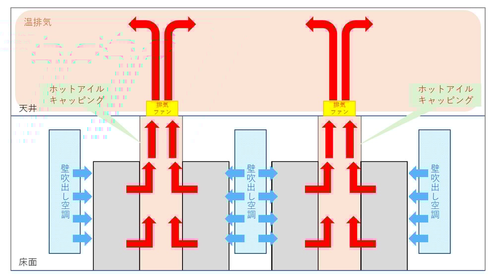 特に温排気を閉じ込めて天井裏から排気する方式を「ホットアイルキャッピング」と呼びます。